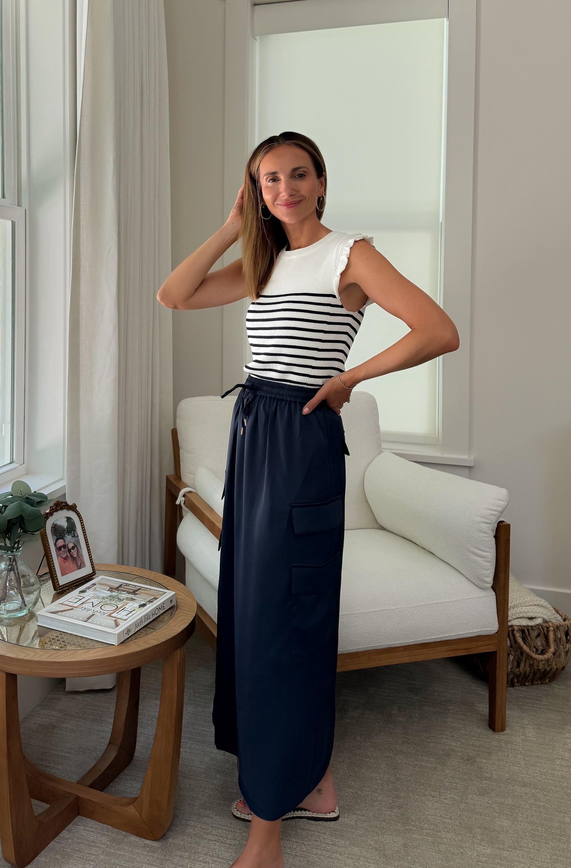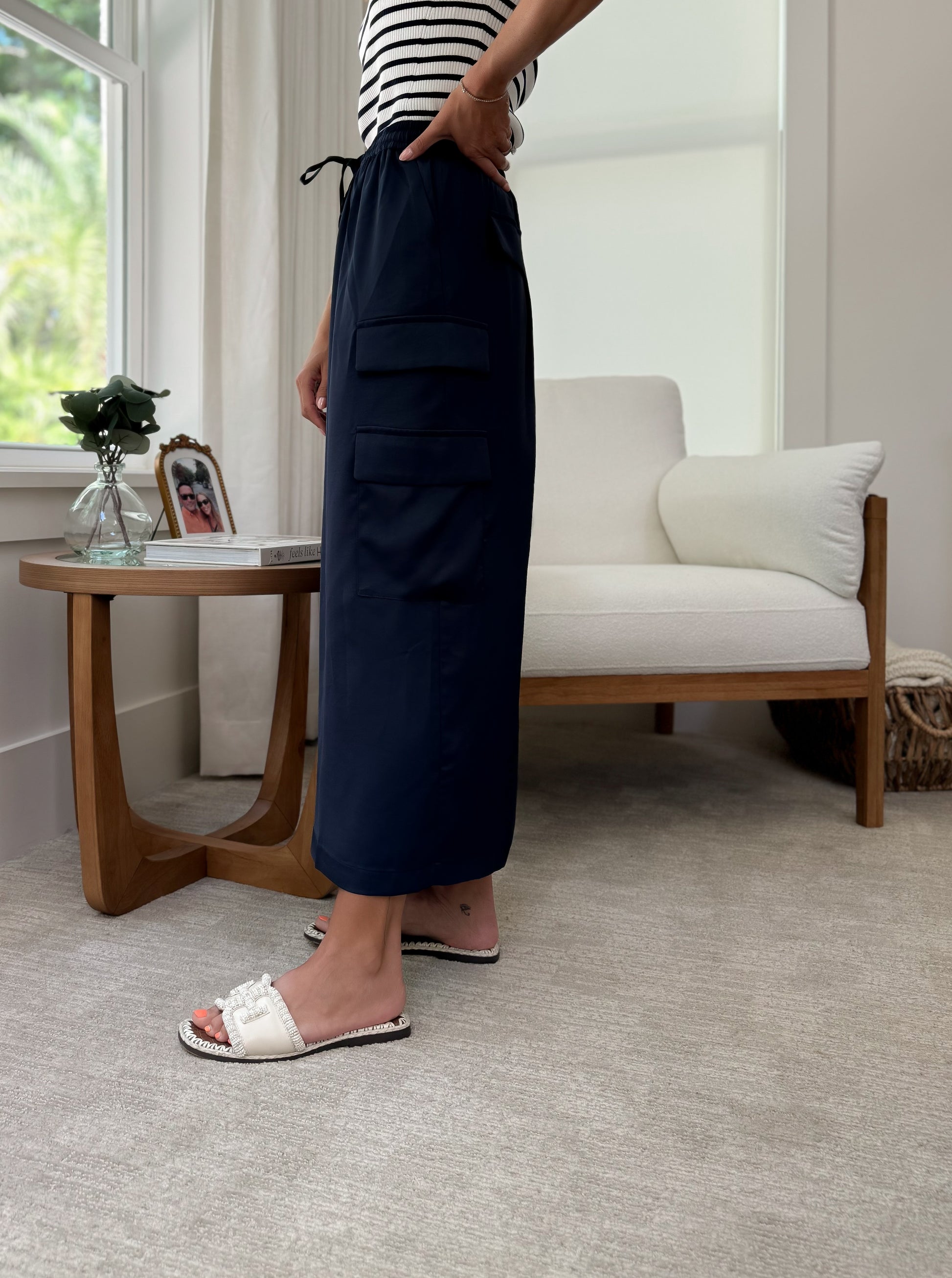 Introducing Make My Day midi skirt in a beautiful navy color, designed to elevate your style with a touch of elegance. This skirt features trendy cargo pockets that add a modern and chic flair to the classic silhouette.  Embrace the versatility of this wardrobe staple and effortlessly exude confidence and style.